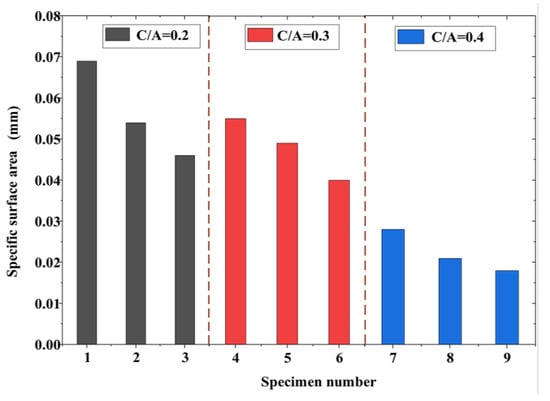 When the ash set ratio differed, the specific surface area of the pervious concrete exhibited noticeable variations based on the porosity, as illustrated in Figure 6. Similarly, the specific surface area significantly differed when the particle size varied with the same ash set ratio. This observation indicated that both the pore size and porosity had a substantial impact on the specific surface area. First, a large porosity corresponded to more pores, resulting in a high total perimeter of pores in the cross-section and a higher specific surface area per unit volume. Moreover, for specimens with the same porosity, large pores were present in aggregate blocks with large sizes. In contrast, reducing the particle size of the aggregate caused large pores to fragment into multiple smaller pores. Consequently, the specimens with small aggregate sizes exhibited a larger specific surface area with the same planar porosity.