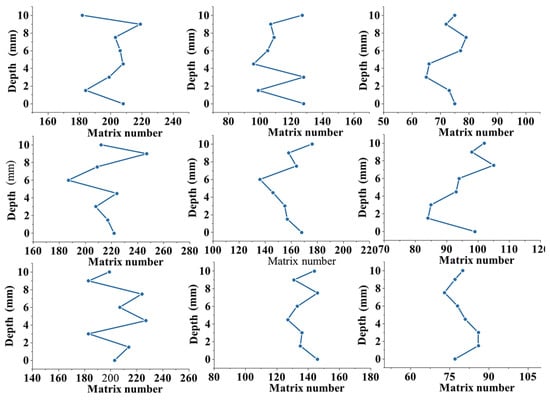 The change in the number of cement matrices within the pervious concrete was observed by quantifying the matrices in each section and plotting the change along the depth of the specimen (Figure 7). The increase in the cement content affected the number of bonded matrices; however, the magnitude of the change remained constant. An exception to this was when the aggregate particle size was 2.36–4.74 mm, and the cement content increased from 20% to 30%, significantly increasing the bulk of the bonded region. This can be explained by the fact that specimens with small particle sizes and high porosity have large specific surface areas, and they require a sufficient number of cement matrices for the complete encapsulation of the aggregate. When the cement content was 20%, the cement did not fully encapsulate the aggregate. The small pores connected, forming larger pores and reducing the number of encapsulating cement matrices. However, the increase in the cement content from 20% to 30% caused the cement to split the large pores, forming independent small pores and increasing the number of bonded matrices. In contrast, when the aggregate particles were large, the number of bonded matrices significantly decreased. For particle sizes in the ranges of 2.36–4.75, 4.75–9.5, and 9.5–16 mm, the numbers of matrices were in the ranges of 210–220, 100–160, and approximately 80, respectively. In conclusion, the characteristics and thickness of the cement paste coating had negligible effects on the number of bonded matrices. In the pervious concrete, the number of such matrices was mainly influenced by the aggregate size; the nature of the cement paste did not play a significant role.