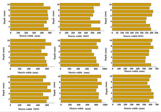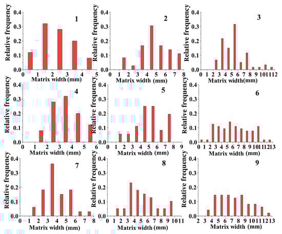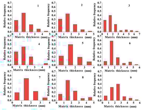 Compared with the range of the matrix width distribution, that of the matrix thickness was generally smaller, as shown in Figure 9. When the aggregate particle size was the same, the highest values of the thickness distribution were all in the range of 1–2 mm (except for that of group 9). However, as the particle size increased, the range of the thickness distribution gradually increased. Therefore, the effect of the aggregate particle size on the thickness of the bonded matrix was greater than that of the cement content. The matrix thickness of the specimens in all groups (except for those with a particle size ranging from 9.5 to 16 mm) was less than 2. In groups 3, 6, and 9, when the particle size was 9.5–16 mm, the matrix thickness values were 2.46, 2.82, and 3.12 mm, respectively.