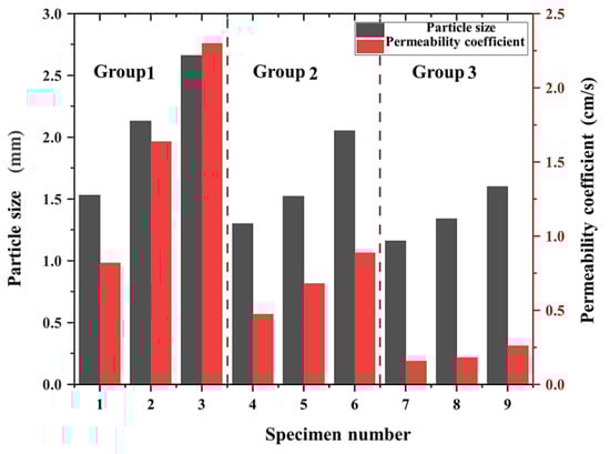 As shown in Figure 10, the permeability coefficient of the pervious concrete increased with the pore diameter. For instance, in group 1, when the pore diameter was 1.53 mm, the permeability coefficient was 0.82 cm/s. When the pore diameter increased to 2.13 and 2.66 mm, the permeability coefficients increased to 1.64 and 1.72 cm/s, respectively. Similarly, in groups 2 and 3, the permeability coefficient of the pervious concrete increased with the pore diameters. This can be explained by the fact that, although the porosity of the test block remained the same, a larger pore diameter provided a wider internal percolation channel. Lu et al. [27] found that, with the same porosity, a larger aggregate size or pore size could increase the pore connectivity factor, and Lima et al. [28] also argued that permeable concrete had greater permeability due to its larger pore size and greater connectivity, which was in agreement with the findings in this study. As a result, the percolation path became less zigzagged, and the time taken for the passage of water through the channel was reduced. Consequently, more water could flow through the channel per unit of time, resulting in a larger permeability coefficient. In contrast, a small pore diameter created a narrow internal percolation path, limiting water flow. Water tension prevented the flow of water through the seepage channels of pores of a small size, rendering the path even more tortuous. Thus, a small pore size led to a narrow internal seepage path and increased the water tension, resulting in a tortuous path that hindered water flow.