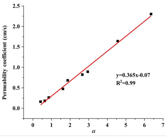 The relationship between the permeability coefficient and the pore parameter is depicted in Figure 11. The figure illustrates that the two variables had a positive correlation. Specifically, the permeability coefficient could be calculated as the ratio of the third power of porosity to the square of the specific surface area. However, note that the permeability coefficient derived from the macroscopic tests increased with the porosity and decreased with the specific surface area (assuming that the porosity remained constant).