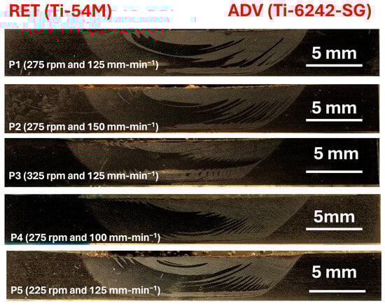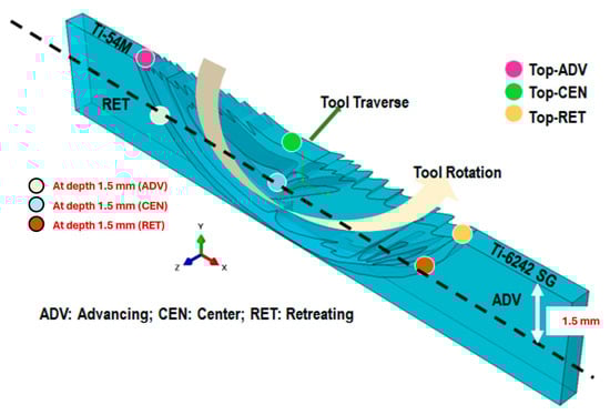 The 5 mm thick as-milled sheets of Ti-5Al-4V M (on the retreating (RET) side) and Ti-6Al-2Sn-4Zr-2Mo standard grain (SG) (on the advancing (ADV) side) as provided by The Boeing Company were welded using three rotation speeds (225, 275, and 325 rpm) and traverse speeds (100, 125, and 150 mm/min) to produce a panel measuring . Frictional heat-assisted softening, deformation, and eventual solid-state linkage between these two sheets were facilitated by a tapered W-La (tungsten-lanthanum) tool, the dimensions of which are proprietary to The Boeing Company (Seattle, WA, USA). The FSW machine’s automation, placement of the backing anvil, tool insertion, and a 2° tilt on the retreating side, along with controlled argon (Ar) flow, were meticulously managed to ensure defect-free and flashless welds.