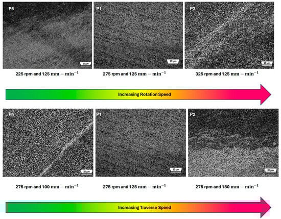 Another potential explanation for this phenomenon is that the lower transverse speed causes a greater portion of the plasticized material from the advancing side (ADV) to accumulate in the weld nugget without the formation of adiabatic shear bands, as observed in Figure 2.