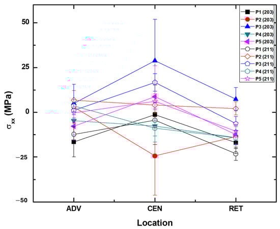 Hence, to mitigate measurement errors, peaks (203) and (211) were selected alongside suitable absorption filters, and regression schemes provided in LEPTOS® were utilized. This peak at angle 102° exhibits significantly higher intensity and minimal presence of doublet, including , , and , along with . Given that these welded specimens are subjected to multiaxial stress states during loading or unloading in real-world applications, it becomes crucial to characterize their stress states in terms of equivalent uniaxial stresses. Thus, Von Mises principal stresses were employed to facilitate comparison of XRD results. The ensuing discussion presents the results of the equivalent corresponding to the peak (203) [].