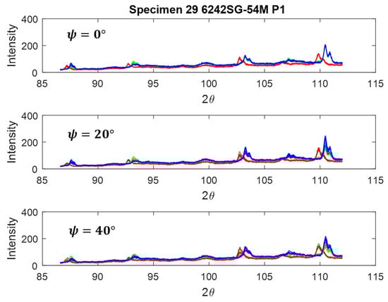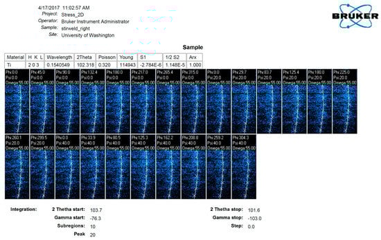 Utilizing diffraction data from area detectors, stress measurement followed conventional methodologies such as the method or other algorithms originally developed for conventional diffractometers equipped with point or line detectors. The diffraction profiles resulting from -integration were treated similarly to those obtained from a line detector or scanning point detector, as illustrated in Figure 5, which showcases an experimental instance. The residual stress measurement was conducted using a GADDS™ (Bruker, Billerica, MA, USA) microdiffraction system.