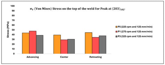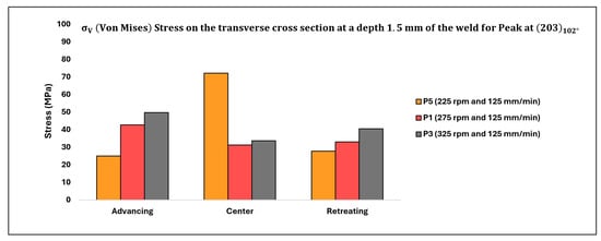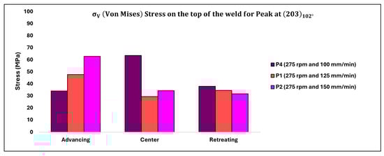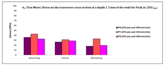 The distribution of residual stresses ( as affected by traverse speed on the top surface of the weld and at a depth of 1.5 mm below the top surface of the weld, observed in the transverse cross-section, is illustrated in Figure 16 and Figure 17, respectively, focusing solely on the peak (203) observed at approximately 102°. Upon comparing Figure 15, Figure 16 and Figure 17, an intriguing observation emerges: the impact of traverse speed is more pronounced on the top surface of the weld, while the effect of rotation speed is more prominent at a depth of 1.5 mm below the top surface of the weld.