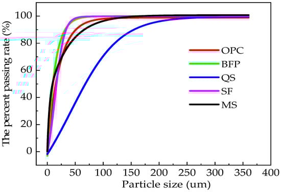 The Ordinary Portland Cement (OPC) used in this study was sourced from Jiangsu Changlong Cement Manufacturing Co., Ltd., Xuzhou, China. It had a density of 3.01 g/cm3, an initial setting time of 117 min, and a final setting time of 226 min. The strength class of the OPC was 45 MPa. We also used a type of mineral admixture known as ultra-fine silica fume (SF), provided by Nanjing Hongqian Environmental Protection Engineering Co., Ltd., Nanjing, China. This silica fume had a density of 2.31 g/cm3, a specific surface area of 14.8 m2/g, and a SiO2 content of higher than 97.4%. The additive material used in this study included manganese slag (MS) obtained from Beijing Baolaier Technology Co., Ltd., Beijing, China. MS was a byproduct produced by electrolytic manganese ore. The blast-furnace slag powder (BFP) was provided by Lingshou County Qiangdong Mineral Products Processing Factory, Shijiazhuan, China. The BFP shows the density and the specific surface area of 2.91 g/cm3 and 436.2 m2/g, respectively. Quartz sand (QS), sourced from the Lingshou County Quanfeng Mineral Products Processing Factory in Lingshou, China, was used as the aggregate. The particle size ranges for the quartz sand were 1 mm~0.5 mm, 0.5 mm~0.1 mm, and 0.1 mm~0.01 mm. To adjust the fluidity of the fresh high-performance concrete (HPC), we used a TD-JSS1 polycarboxylic acid high-range water-reducing agent (HRWR); this was provided by Shanxi Kebang Building Materials Co., Ltd., Yuncheng, China. The setting times, densities, and physical properties of the raw materials were readily provided by the suppliers. Table 1 and Table 2 show the cumulative retained fractional pass rates and chemical compositions, respectively, of the raw materials. Particle size distribution curves for the raw materials are shown in Figure 2, which is obtained from Xu’s paper [25]. Finally, the basalt fibers used in this study were manufactured by Shandong Taicheng Fiber Co., Ltd., Taian, China. The average lengths and diameters of the basalt fibers were 6 mm and 0.025 mm, respectively, and their corresponding density was 2.631 g/cm3.