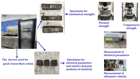 where v1 and vt are the ultrasonic velocities of the samples after periods of salt action of 0 and t, respectively. MLR and RDME were measured using samples with dimensions of 100 × 100 × 100 mm3. Figure 4 shows a flowchart of the experimental procedure. The measuring method was according to the standard UNE-CEN/TS 12390-2008 [29].