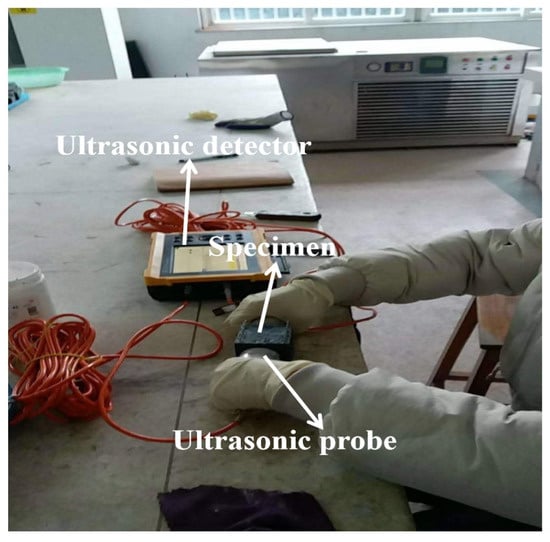 A CSM900C digital ultrasonic flaw detector produced by Sanmukeyi Instrument Testing Technology Co., Ltd., Jinan, China, was used to obtain the relative dynamic modulus of elasticity (RDME). A transmit-and-receive ultrasonic head was attached firmly to a central position on each specimen. Probes and specimens were matched using petroleum. Ultrasonic velocities were measured as shown in Figure 6, and RDME was calculated using Equation (2), as follows: