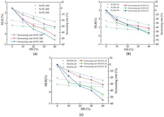 The MLR of HPC under salt action. (a) The MLR of HPC during NaCl freeze–thaw cycles. (b) The MLR of HPC during NaCl dry–wet alternations. (c) The MLR of HPC during Na2SO4 dry–wet alternations.
