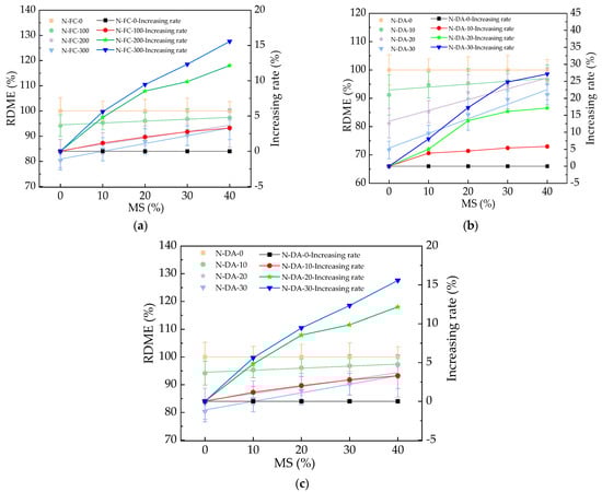 The RDME of HPC after different cycles of N-FC, N-DA, and NS-DA are provided in Figure 8. The RDME of HPC decreased with the effect of N-FC, N-DA, and NS-DA. This was attributed to the width and the number of internal cracks in HPC by the salt action, which slowed down the propagation of sound waves in HPC [37]. Consequently, the RDME of HPC was decreased by the effects of N-FC, N-DA, and NS-DA. Meanwhile, the RDME of HPC was increased by adding the MS with the increasing rates of 0~15.7%, 0~27.1%, and 0~13.7%, respectively, under the actions of N-FC, N-DA, and NS-DA, which was ascribed to the microaggregate effect and the pozzolanic effect just in the analysis of Section 3.1 [38]. The error bars’ values were lower than 7.9% of the real MRL values, ensuring the experimental correctness. HPC showed the highest RDME after 30 NS-DW. Meanwhile, the RDME of HPC was the lowest after 30 N-DA. Table 5 demonstrates the fitting equations of the relationships between the RDME and MS’s mass ratios. As depicted in Table 5, the equations are linear functions, and the fitting degrees of the fitting equations are higher than or equal to 0.90, ensuring the reasonability of fitting functions. The RDME of HPC was 0~7.1% higher than the HPC with waste fly ash and secondary aluminum ash.