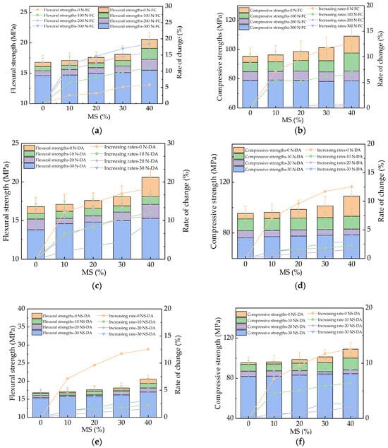 Figure 9 provides the flexural and compressive strengths of HPC with MS during the N-FC, N-DA, and NS-DA actions. The mechanical strengths of HPC were decreased by N-FC, N-DA, and NS-DA actions. This could be explained by the increased number and length of cracks in HPC, leading to decreased mechanical strengths [39]. As depicted in Figure 9, after salt action, the flexural strengths were increased by the added MS with varying rates of 0~17.3%, 0~18.6%, and 0~17.1% under the N-FC, N-DA, and NS-DA actions, respectively. Meanwhile, the corresponding compressive strengths were increased by the rates of 0~11.7%, 0~12.63%, and 0~11.3%. The microaggregate effect and the pozzolanic effect were improved by adding the MS, which decreased the internal crack propagation, resulting in a decline in mechanical strength loss [40]. The mechanical strengths of HPC after NS-DA were the highest, while the corresponding mechanical strengths of HPC after N-DA were the lowest. The error bars’ values were lower than 8.2% of the real values of mechanical strengths, indicating the experimental accuracy. Compared with the HPC with fly ash and secondary aluminum ash, the flexural and compressive strengths of HPC were 0~11.3% and 0~17.2% higher [23].