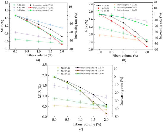 The MLR of HPC after different numbers of N-FC, N-DA, and NS-DA actions are shown in Figure 10. As shown in Figure 10, the MLR increased with the increasing numbers of N-FC, N-DA, and NS-DA and decreased with the added basalt fibers with the decreasing rates of 0~34.8%, 0~55.1%, and 0~45.3%, respectively. The basalt fibers showed decreasing effects on the increasing rates of MLR by the N-FC, N-DA, and NS-DA. This was because the added basalt fibers can limit cracks in HPC to achieve the goal of reducing surface peeling and reducing the MLR [41]. After salt action, the MLR of HPC with basalt fibers was the highest after suffering 40 N-DA. Meanwhile, HPC with basalt fibers showed the lowest MLR after 40 NS-DA. The error bars’ values were lower than 9.3% of the real values of the MLR, ensuring the experimental accuracy. The fitting equations of the relationships between the MLR and BF’s volume ratios are illustrated in Table 6. As depicted in Table 6, the equations were linear functions, and the fitting degrees of the fitting equations were higher than or equal to 0.95, which ensured that most of the variance of the tests (>95%) was explained by the linear fit.