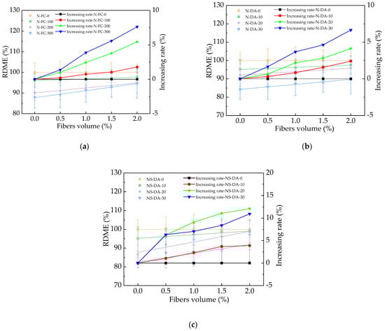 The RDME of HPC with basalt fibers is depicted in Figure 11. As shown in Figure 11, the HPC’s RDME decreased after 300 N-FC, 30 N-DA, and 30 NS-DA. After the basalt fibers were added, the corresponding decreasing rates of RDME by basalt fibers were decreased by 0~7.62%, 0~6.65%, and 0~12.11%, respectively. The reason for this was that the basalt fibers could bridge the cracks in HPC, which limited the propagation of cracks [42]. Therefore, a decrease in the speed of sound propagation in HPC occurred. The RDME of HPC with basalt fibers after 30 NS-DW was the highest, while HPC with basalt fibers showed the lowest RDME after 30 N-DW. The corresponding error bars’ values were lower than 9.1% of the real values of the HPC’s RDME, which indicated the experimental exactitude. The fitting equations of the relationships between the RDME and BF’s volume ratios are illustrated in Table 7. As depicted in Table 7, the equations were linear functions, and the fitting degrees of the fitting equations were higher than or equal to 0.91, which ensured the reasonability of fitting functions.