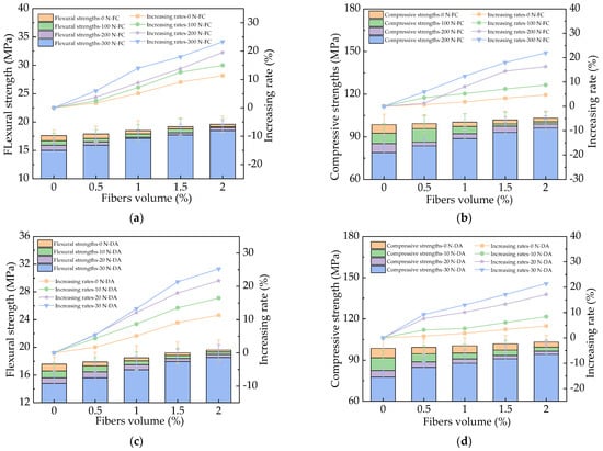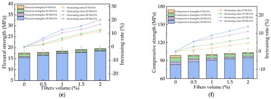 The mechanical strengths of HPC with basalt fibers are provided in Figure 12. As illustrated in Figure 12, the mechanical strengths obviously decreased after the actions of N-FC, N-DA, and NS-DA due to the increased cracking by salt action [43]. After the basalt fibers were added, the increasing rates of flexural strength were 0~22.1%, 0~23.6%, and 0~20.4% after 300 N-FC, 30 N-DA, and 30 NS-DA. The corresponding compressive strengths’ increasing rates were 0~21.3%, 0~20.2%, and 0~13.6% after salt action. The corresponding error bars’ values were lower than 9.1% of the real values of the HPC’s mechanical strengths, indicating the experimental accuracy.