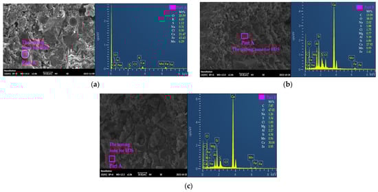 The SEM-EDS of HPC with MS under salt erosion. (a) The SEM-EDS photos of specimens before salt action. (b) The SEM-EDS photos of specimens after 30 NaCl dry–wet alternations. (c) The SEM-EDS photos of specimens after 30 Na2SO4 dry–wet alternations.