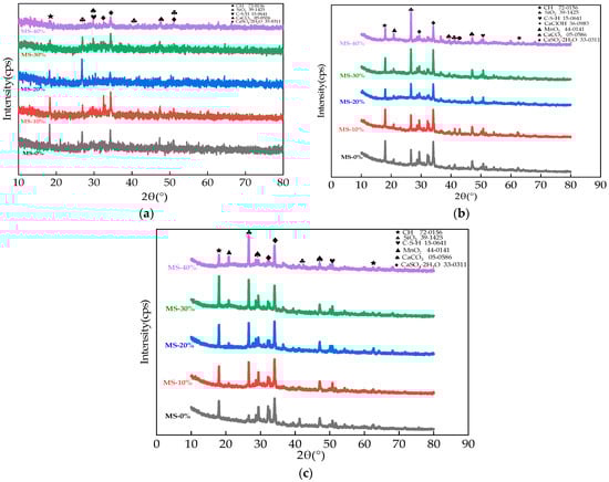 The XRD curves of HPC with MS are shown in Figure 14. As shown in Figure 14, the crystals of SiO2, Ca(OH)2 (CH), CaSO4·2H2O, calcium silicate hydrate (C-S-H), and CaCO3 were discovered in all specimens. The CaClOH crystals were observed after the NaCl dry–wet actions. This was attributed to the fact that the actions of the dry–wet alternations could increase the hydration between the cement and the NaCl solution, thus forming the chloride complex salt. When the 30 Na2SO4 dry–wet alternations actions were finished, the diffraction peaks of Fe2SO3 were increased by the increasing dosages of MS, since the Fe content was increased by the added MS [44]. When the dry–wet alternations of Na2SO4 were applied to the specimens (the iron), the diffraction peaks of Fe2SO3 crystals increased. Moreover, the CaSO4 crystals’ diffraction peaks were increased by the dry–wet alternations with Na2SO4 solution. This could be explained by the reaction of the Ca(OH)2 and the Na2SO4, forming the CaSO4 [45].