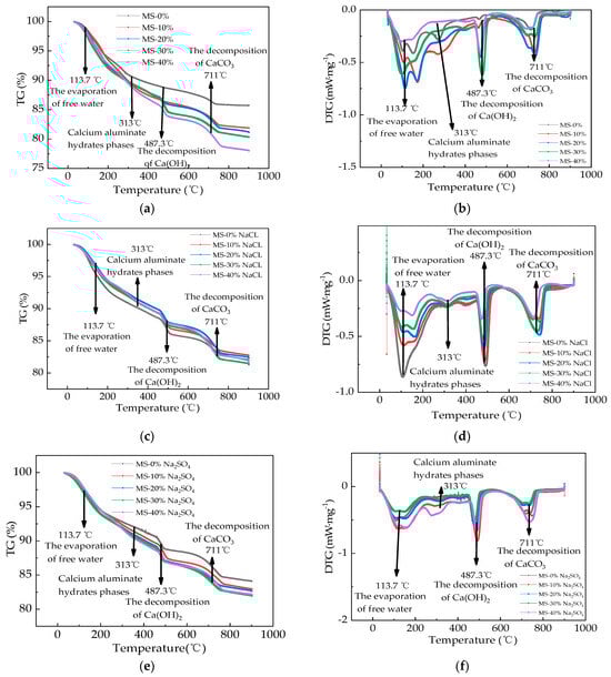 The TG curves of HPC with MS are provided in Figure 15. In Figure 15, the curves can be divided into four parts. In stage one, the temperature varied from 33 °C to 113.7 °C (the first peak shown in Figure 15b,d,f), and the TG showed a declining trend ranging from 100% to 94.3%. This could be explained by the evaporation of free water in pore solution [46]. In the second stage, the TG values decreased from 94.3% to 86.7% with the temperature ranging from 113.7 °C to 487.3 °C due to the decomposition of calcium silicate hydrate (C-S-H) and calcium aluminate hydrates phases [47]. The second peak (313 °C shown in Figure 15b,d,f) indicated the calcium aluminate hydrates phases. In the third stage, the TG values’ range was 86.7~82.8% with the temperature ranging from 487.3 °C to 711 °C, which was ascribed to the decomposed Ca(OH)2 hydration products. In the fourth stage, the TG values varied from 82.8% to 80.7% with the temperature ranging from 711 °C to 900 °C, which was ascribed to the CaCO3’s decomposition. The addition of MS could increase the degree of decline in the TG values. This could be explained by the improved pozzolanic effect of MS. Therefore, the TG values were decreased by the added MS [48]. When the salt actions were exerted on the specimens, the decline in the TG values decreased. This was attributed to the infiltration and decomposition of salts [49]. The TG values showed the least decline after the 30 N-DW.