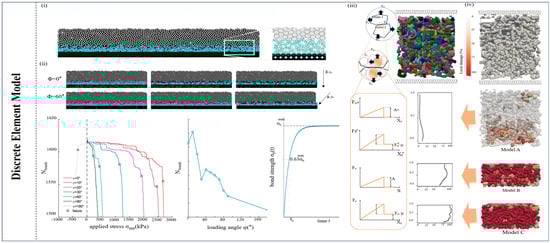 A summary of DEM numerical simulation [68,70,71]. (i) The simulated weak snow layer (blue)—slab (gray) system and the magnified image. (ii) Different states of snow under pressure simulation, cohesive bonds as a function of the applied stress, and the number of broken bonds at failure as a function of the loading angle. (iii) The snow sample was modeled in the DEM, along with boundary conditions, and applied to the load. Individual grains are marked with varying colors for clarity. (iv) Three snapshots of the distribution of the local damage at different times and the final vertical profile of the damage.