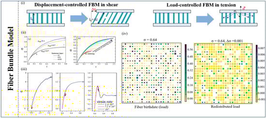 A summary of the FBM numerical simulation [98,99,100]. (i) Two models of theories of the FBM. (ii) Stress–strain relations of two FBM models, (a) comes from the first model in (i), (b) comes from the second model in (ii), different colors mean different sintering load. (iii) The ductile-to-brittle transition of the displacement-controlled FBM model. (iv) A snapshot of the FBM for a single load step in the form of 2D maps of the fiber bundle illustrating the sintering and load relaxation processes.