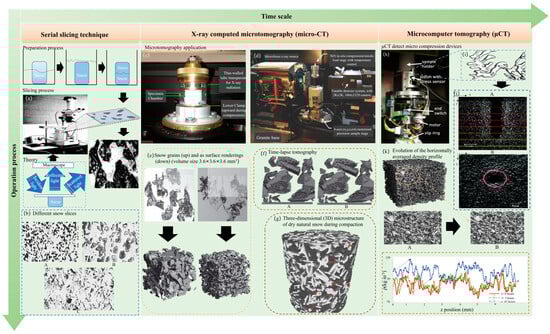 A summary of the three-dimensional solid modeling of snow. (a) Continuous sections and continuous micrographs are taken [122]. (b) Examples of snow sections [123]; image (A) is the partially metamorphosed snow of mid-density (−200 kg/m3), image (B) is the snow metamorphosed for 6 months at a weak temperature gradient (−1 °C/m), and image (C) is the snow metamorphosed for 100 h in an intense temperature gradient (>1000 °C/m). (c) The SkyScan material test bench for the micro-CT system for scanning snow blocks [124]. (d) The experimental arrangement of the micro-CT system [125]. (e) Typical snow types presented as snow grains (left) and as surface renderings (right) [126]. (f) Two images separated by 2 days from a time-lapse movie [126], image (A) at time 577 h, image (B) at time 625 h. (g) Three-dimensional images of the distribution of snow grains [125]. (h) μCT detect micro compression devices [127]. (i) The snow grains are imaged under the microscope [128]. (j) An overview of μCT image analysis [129]; (A) is the picture of the snow vertical transect μCT and (B) is the picture of snow horizontal transect μCT. (k) An X-ray microtomography analysis of the isothermal densification of new snow under external mechanical stress [130].