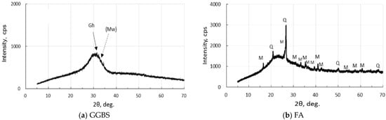 XRD analysis was carried out, employing MiniFlex 300/600 made by Rigaku Corporation in Tokyo, Japan. The operating conditions are as follows: 40 kV-15 mA X-ray tube power, doubly Ni-filtered CuKα radiation, 4°/min-0.01° step scan, 1.25°-10 mm-13 mm-13 mm slit system, and 5–70°, 2θ range. XRD diagrams of the active fillers are represented in Figure 1. GGBS has few crystals, and FA contains quartz and mullite in addition to amorphous phases. There were few iron-bearing minerals in two fillers.
