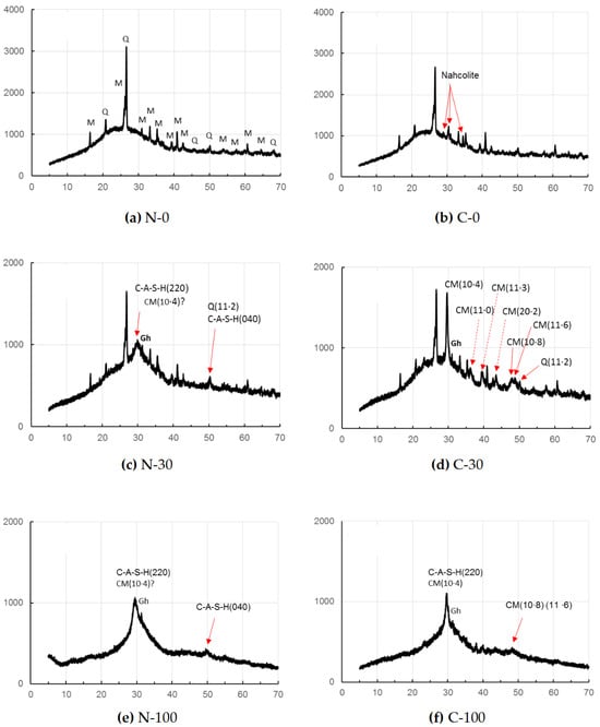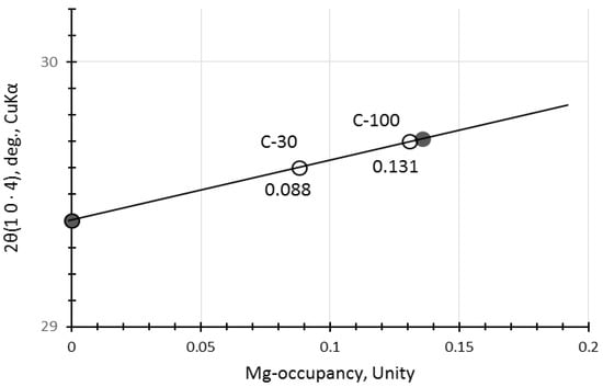 The calcite may not be a pure calcite but includes some magnesium, yielding magnesian calcite (Mg-calcite) [35,51]. Hence, 2θ positions of calcite were a little bit shifted to higher angles due to contraction of different ionic radii between Ca2+(0.114 nm) and Mg2+(0.086 nm) [52,53]. The calibration curve produced from the file data (XRD cards, ICDD #01-081-2027 (synthetic calcite) and #00-043-0697 (natural Mg-calcite)) is represented in Figure 3, which shows that magnesium occupancy was reached up to 0.13 in the Mg-calcite in the accelerated carbonation samples, C-30 and C-100. Data from non-carbonated samples were omitted due to the ambiguity of calcite peak in the XRD patterns of N-30 and N-100.