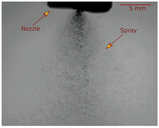 The onset of phase change occurs at nucleation sites, and the vapor bubbles begin to emerge from these sites. In pure water without impurities and dissolved gas, the wall of the nozzle is the main nucleation site. In suspension, in addition to the wall roughness, the surface of TiO2 particles can promote the formation of steam bubbles. These vapor bubbles start growing rapidly, eventually reaching a point of expansion where they finally burst, breaking the suspension jet into smaller droplets. The flash-boiling atomized spray jet of titanium dioxide suspension is shown in Figure 3.