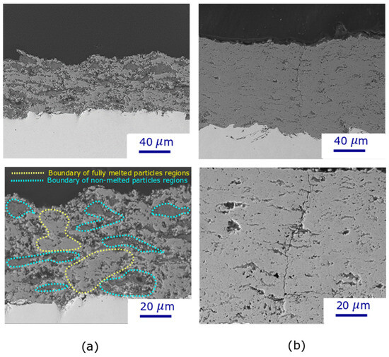 Regardless of torch power, no cracks are observed in the deposits produced with low solid concentrations. However, many horizontal and vertical cracks can be found at the boundaries between unmelted and well-melted particles in the high-concentration, low-torch-power deposits (Figure 6a) because these sections are the weakest part of the deposits. In addition, vertical cracks appeared in the high solid concentration and high torch power deposits (Figure 6b). These vertical cracks can enhance the strain tolerance of the coatings. When the coating is subjected to mechanical stresses or strains, these cracks help distribute the stress more evenly by deflecting and absorbing energy. Additionally, they provide pathways for the dissipation of mechanical energy.