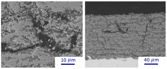 The cross-sectional microstructure of the TiO2 deposit obtained through flash-boiling spray with a high-power torch (110 kW) and low solids concentration is illustrated in Figure 4. A bimodal microstructure can be observed for the deposit: fully melted particles (light region) and unmelted particles (gray region). In addition, some dark areas correspond to the porosity observed in the deposit, which is negligible compared to other sections.