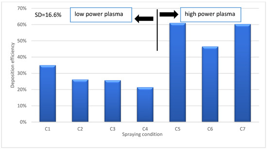 However, it was also observed that increasing the solid content at high torch power would increase the deposition efficiency (Figure 10). In particular, the deposition efficiency increased from 46% for C6 (20 wt% at 110 kW torch power) to 60% for C7 deposit (70 wt%). This is consistent with the findings of Curry et al. [31], who also showed that increasing the solids content at a high torch power of 105 kW would increase the deposition efficiency. In addition, the deposition efficiency was significantly improved by increasing the torch power at constant solids concentration. For example, the deposition efficiency is 25% for deposit C3 (33 kW) and increases to 61% for deposit C5 (70 kW power) (Figure 10). The reason for these high deposition efficiencies can be related to the higher input power, which not only compensates for the energy lost in water evaporation but also allows for more complete particle melting.