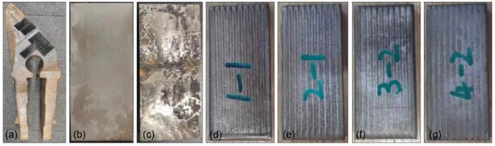 Typical macroscopic images of the specimens: (a) bucket tooth after wire-electrode cutting, (b) substrate, (c) hardfacing specimen, and (d–g) laser cladding specimens.