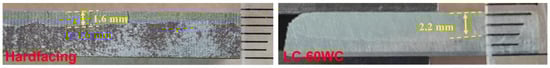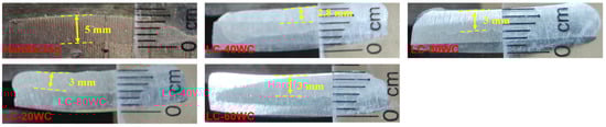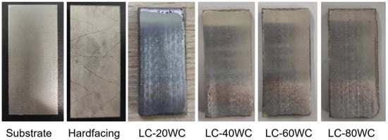 Figure 3a shows the real image of the bucket tooth after wire-electrode cutting. The macroscopic morphology of the substrate and hardfacing samples obtained by cutting is shown in Figure 3b,c, and the corresponding chemical compositions are given in Table 1. The wear-resistant coating was prepared on the substrate surface using laser cladding technology. The designed compositions of the coating are shown in Table 1, and the macroscopic morphology of the sample after cladding is shown in Figure 3d,g. Figure 4 shows the cross-section images of the hardfacing sample and laser cladding samples with different contents of WC addition. The thickness of the hardfacing layer was about 5 mm, and the thickness of the laser cladding coatings was about 2.8~3 mm.