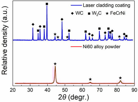 Figure 8 shows the phase evaluation of the coating after laser cladding. It can be seen that the phase of the Ni60 alloy powder is mainly the peak of NiCrFe (PDF card: 35-1375). For the laser cladding coating with 80 wt.% WC, peaks of WC (PDF card: 65-8828) and W2C (PDF card: 65-3896) are also detected besides the NiCrFe phase. According to the SEM images on the surface and the XRD analysis, it can be inferred that most of the WC is retained, while some WC is decarbonized in the laser cladding process, forming W2C.