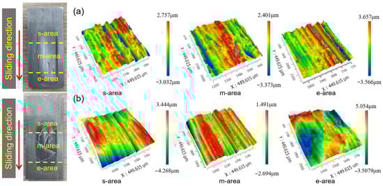 Figure 11 shows the typical photos and 3D white-light interferograms of the abraded surface of the substrate and hardfacing layer after the dry sand rubber wheel tests. The abraded surface was divided into starting area (s-area), middle area (m-area), and ending area (e-area) according to the order of contact with the sand particles. During the wear process, the sand particle entered the contact area between the rubber wheel and the sample from the s-area, forming three-body wear. Then, the sand particle was driven into the m-area under the rotation of the rubber wheel. In this process, the contact load between the sand particle and the sample gradually increased, reaching the maximum in the middle part. Therefore, the m-area displayed the most severe wear and the deepest wear marks. Finally, the sand slipped to the e-area and then separated from the sample. In this process, the contact load between the sand particle and the sample gradually decreased and some of the sand particles were broken.