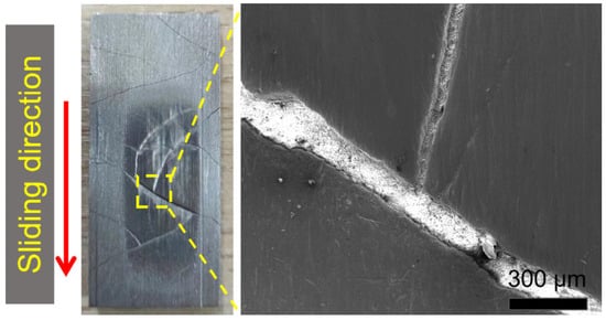 Typical photo and SEM image of the crack wear area of the hard-facing layer. The red arrow represents the sliding direction during the wear test.