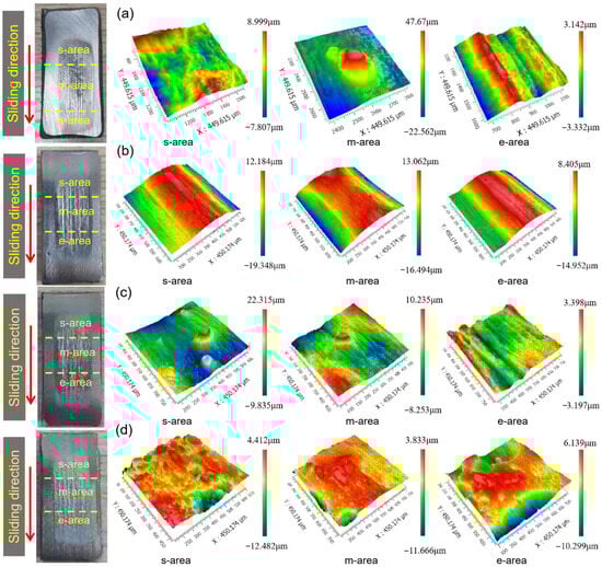 Typical photos and 3D white-light interferograms of the abraded surface of the laser cladding coating with different WC addition: (a) 20 wt.%, (b) 40 wt.%, (c) 60 wt.%, and (d) 80 wt.%. The red arrow represents the sliding direction during the wear test.