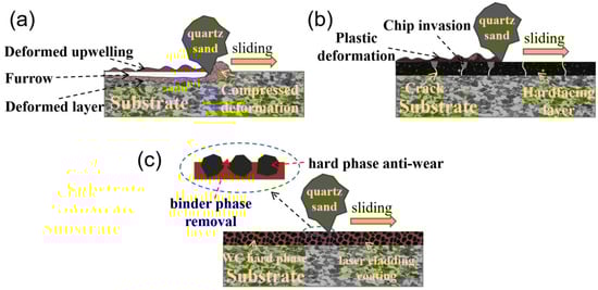 Schematic description of the different abrasive wear mechanisms of the substrate (a), hardfacing layer (b), and laser cladding coating (c).