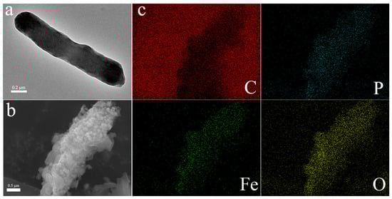 To demonstrate the feasibility of the hybridization of the magnetic nanomaterial γ-Fe2O3 with microorganisms, a morphology analysis of CN32 and CN32@γ-Fe2O3 was performed using SEM and TEM. Figure S2 presents the X-ray diffraction pattern of the modified material γ-Fe2O3 nanoparticles. The structure reveals characteristic diffraction peaks at 2θ = 30.2, 35.5, 43.2, 53.7, 57.3, and 62.8 corresponding to the (220), (311), (400), (422), (511), and (440) crystal planes. These planes align with the standard JCPDS No. 00-039-1346 crystal structure features [], confirming the material’s identity as γ-Fe2O3. By comparing (Figure 2a,b), it can be seen that the unmodified S. putrefaciens CN32 was rod-shaped and had a smooth surface. After γ-Fe2O3 MNPs were added for hybrid cultivation, the bacteria surface became rough due to the particle encapsulation, indicating the successful hybridization of γ-Fe2O3 MNPs on the surface of the bacteria. As shown in Figure 2c, the elemental analysis results clearly indicate that elements C, P, Fe, and O were uniformly distributed on the surface of the bacteria, further confirming the successful preparation of CN32@γ-Fe2O3. Corresponding data on the elemental composition of the surfaces are presented in Figure S3. The surface elemental analysis data reveal the presence of carbon (C), oxygen (O), iron (Fe), and phosphorus (P), with C and P attributed to bacterial surface constituents and Fe and O indicative of γ-Fe2O3 modifications on the surface.