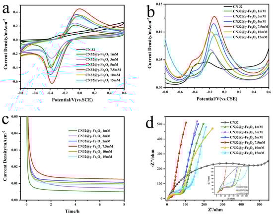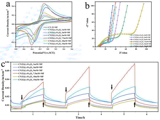 To further investigate the effect of the surface modification of γ-Fe2O3 MNPs on bacterial bioelectrocatalytic and to identify the optimal coating amount, we assembled half-cells with different CN32@γ-Fe2O3 bioanodes, further conducted CV, DPV, EIS, and IT electrochemical tests. Figure 3a reveals the lack of a discernible redox peak in the CV curve of the naturally occurring S. putrefaciens CN32 strain, and only a weak redox peak at approximately −0.45 V (vs. SCE) is observed, which can be attributed to the presence of endogenous electron mediators. It is worth noting that an obvious reversible redox peak pair appears at around −0.4 V and 0 V (vs. SCE) of heterozygous bacteria at all concentrations, which correspond to the endogenous electron mediators and outer membrane C-type cytochrome protein response, respectively. Interestingly, from the CV analysis, it is evident that the oxidation peak current value exhibits a notable upward trend with an increase in the coating amount. This trend reaches its zenith at a coating amount of 7.5 mM γ-Fe2O3 MNPs, after which it gradually diminishes. At the same time, it can be observed that the cathodic and anodic peak separation is minimal for CN32@γ-Fe2O3 + 7.5 mM, indicating a faster electrochemical reaction. γ-Fe2O3 MNPs may serve as efficient electron conduits, facilitating bridging the gap for electron transfer both intra- and inter-cellularly, thus overcoming the limitations associated with long-distance electron transmission and enhancing extracellular electron transfer efficiency []. However, high concentrations of MNPs will decrease the electrocatalytic activity of electricity-producing bacteria, inhibiting their growth and metabolic activity.