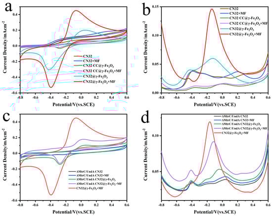 Results of electrochemical behavior tests of γ-Fe2O3 MNPs and EMF for S. putrefaciens CN32 and deletion bacteria ∆MtrC/UndA CN32. (a,c) CV curve with a scan rate of 10 mV s−1. (b,d) DPV curve.