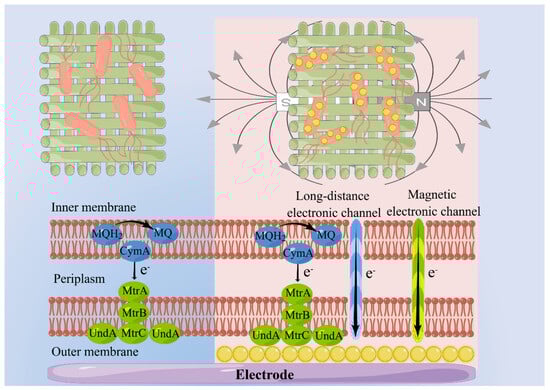 In this study, the magnetic nanomaterials γ-Fe2O3 and S. putrefaciens CN32 were self-assembled to form hybrid bacteria CN32@γ-Fe2O3 (Figure 1). The magnetic nanoparticles in the hybrid bacteria can serve as electron shuttle media and be coupled with electromagnetic fields to construct an MNPs hybrid bacteria-coupled electromagnetic field system to accelerate the bioelectrocatalytic process at the interface, opening up new channels for electron transfer and to improve the EET transfer efficiency and power generation performance. The experimental findings unequivocally demonstrated that the magnetic nanomaterials on the surface of the bacteria enhanced the DET mediated by OM c-Cyts and significantly improved the efficiency of the bacterial and interface EET processes. Under magnetic field stimulation conditions, electrochemical results showed that the MFC system constructed by CN32@γ-Fe2O3 had a smaller peak spacing, a more negative anodic peak potential, a larger oxidation–reduction area, and a lower charge transfer resistance compared to controls. This experiment provides an uncomplicated, efficient, and low-cost technique for modifying S. putrefaciens CN32 using magnetic nanomaterials, which can promote the EET process and has potential value for BES.