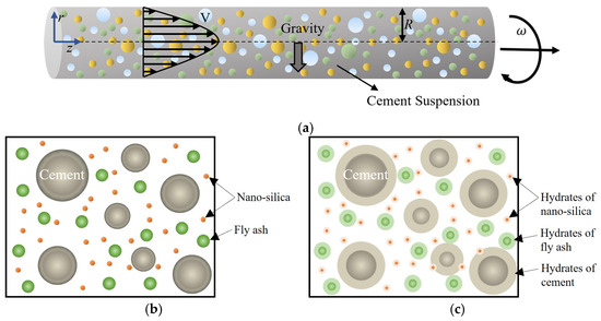 (a) Schematic of the horizontal pipe flow of cement suspension; (b) cement suspension with nano-silica and fly ash additives; (c) hydration of cement, nano-silica, and fly ash.
