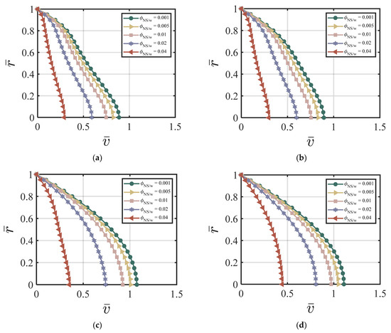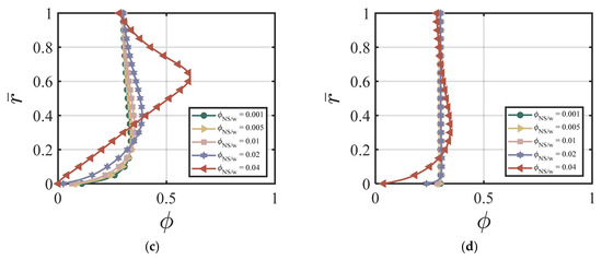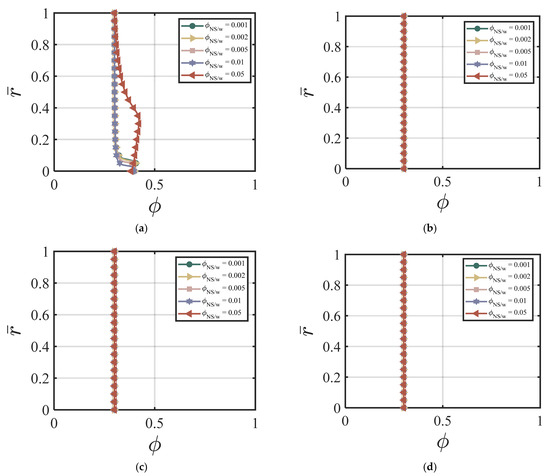 Effect of of the combined NS FA-added cement suspension on volume fraction at (a) cycle #2; (b) cycle #10; (c) cycle #50; (d) cycle #200 with , k = 6.5, , , , , χ = 3.15, ζ = 1, m = 0.5, Re = 100, P = 10, = 0, κ = 0.001.