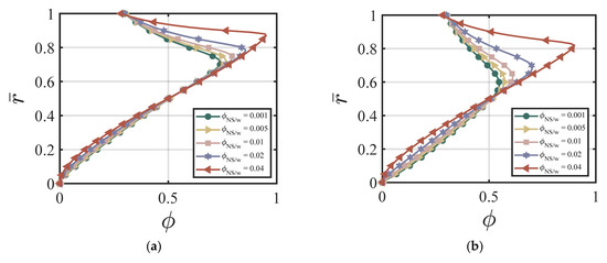 According to Equation (35), this initial concentration near the centerline is smaller than the concentration of the particles at the wall. We carried out some tests for a uniform volume fraction profile at t = 0 and we did not notice any noticeable deviation from the suggested equation given in Equation (35).