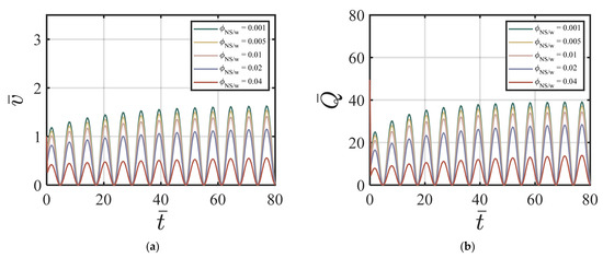 Effect of of the combined NS FA-added cement suspension on (a) vs. t; (b) vs. t with , k = 6.5, , , , , χ = 3.15, ζ = 1, m = 0.5, Re = 100, P = 10, = 0, κ = 0.001.