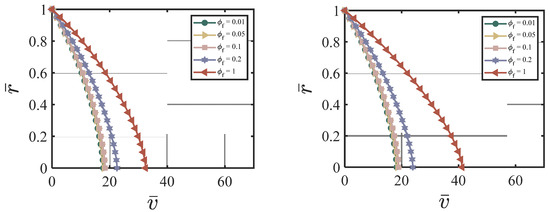 Here, we use the following values for our numerical simulations: , , , , , χ = 3.15, ζ = 1, m = 0.5, Re = 100, P = 10, = 0, κ = 0.001. Figure 8a–d show the effects of on the velocity of the cement suspension with combined nano-silica and fly ash additives at four different time cycles # 2, #10, #50, and #200. From Figure 8a–d, the effect of different values of on velocity is similar to the NS-added cement suspension case. Larger values cause smaller centerline velocity and with the increasing time cycle value, the velocity field does not change much. Figure 9a–d show the effects of on the volume fraction of cement suspension with combined additives at four different time cycles #2, #10, #50, and #200. The volume fraction becomes more uniform in the early time cycle (#10). As shown in Figure 9a–d, after the time cycle 10, the volume fraction profile becomes uniform. Figure 10a,b show the effects of of the cement suspension with combined additives on the velocity and flow rate versus time. According to Figure 8a–d and Figure 10a,b, the dominance of nano-silica is also exhibited with a similar trend in Section 4.3.1. For the case of combined nano-silica and fly ash particles, we find that the nano-silica particles play a dominant effect, where the velocity and the volume fraction fields show similar trends to the case of only nano-silica-added cement suspension. The finding is validated by Wang et al. [50], that nano-silica particles enhance hydration in early stages and provide favorable hydration conditions for fly ash in later stages. García-Taengua, et al. [20] also showed that fly ash did not affect the dormant period of hydration, while the addition of nano-silica shortened the cement hydrate phase. In addition, the synergistic effect of the two additives increases non-evaporative water content and improves pozzolanic activity. Similar findings are found by Kim, et al. [10], indicating the dominant effect of nano-silica added to high-volume fly ash cement composites, resulting in shorter setting time, higher initial and middle stages of hydration rate, and higher compressive strength.