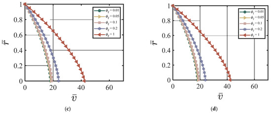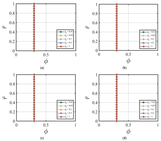 Effect of on the volume fraction at (a) cycle #2; (b) cycle #10; (c) cycle #50; (d) cycle #220 with , k = 6.5, χ = 3.15, ζ = 1, m = 0.5, Re = 100, P = 10, = 0, κ = 0.001.