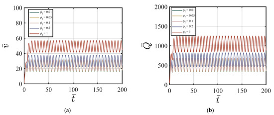 Effect of on (a) vs. t; (b) vs. t with , k = 6.5, χ = 3.15, ζ = 1, m = 0.5, Re = 100, P = 10, = 0, κ = 0.001.