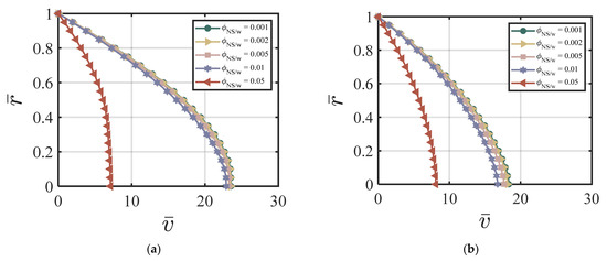 In this section, we demonstrate the effect of nano-silica content on the velocity and the cement volume fraction. As an example, we chose the following dimensionless values for our numerical simulations: , k = 6.5, χ = 3.15, ζ = 1, m = 0.5, Re = 100, P = 10, = 0, κ = 0.001. Figure 2a–d show the effects of different on the velocity at four different time cycles (cycle #2, #10, #50, and #220). According to Figure 2a–d, larger values produce a lower centerline velocity. The velocity profile reaches a steady state and does not change much after 50 time cycles. Figure 3a–d show the effects of different on the cement volume fraction at four different time cycles (cycle #2, #10, #50, and #220). The results show that higher values of results in larger non-uniformity of the volume fraction, especially at the early stages. The volume fraction profiles reach a steady state after 220 time cycles. Figure 4a,b show the effects of on the velocity versus time cycle and the flow rate versus time cycle. The fresh cement suspension with higher nano-silica content reaches the steady state condition faster than those with lower nano-silica content. The results align well with the findings in the literature [9,50,51,52,53] for the effect of nano-silica additives on the early-stage performance of fresh cement suspension. According to Lavergne, et al. [9] and Kim, et al. [10], nano-silica particles accelerated the initial hydration reaction of the cement suspension and increased the shear strength and the early strength significantly because of the specific surface of the nanoparticles, leading to a shorter time of set and a higher compressive early strength.